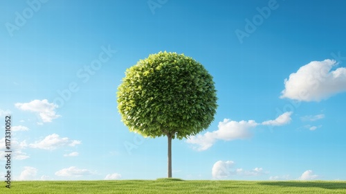 Lush Green Tree with Round Canopy Under Bright Blue Sky and Fluffy White Clouds