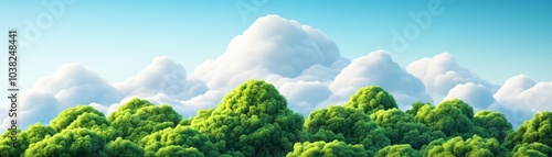 Lush green trees beneath fluffy clouds against a clear blue sky.