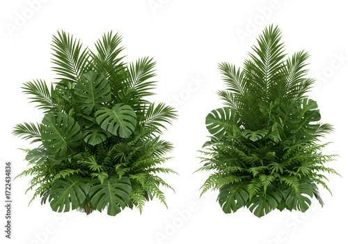 Lush green tropical foliage of two verdant plant groupings, including palm and monstera leaves, isolated against a plain background, evoking nature and serenity.