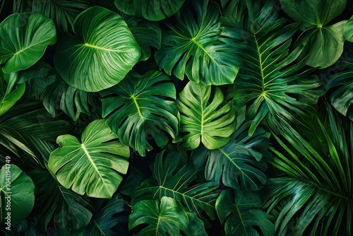 Lush Green Tropical Foliage with Varied Leaf Shapes and Textures