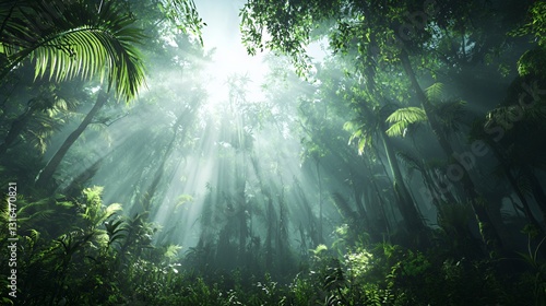 Lush Green Tropical Forest Sunlight Beams Through Canopy
