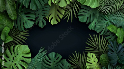 Lush Green Tropical Leaves Frame on Dark Background