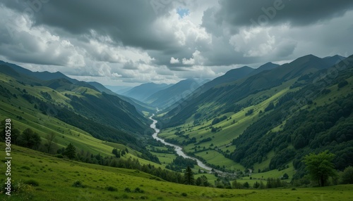 Lush Green Valley with River Under Dramatic Stormy Sky View