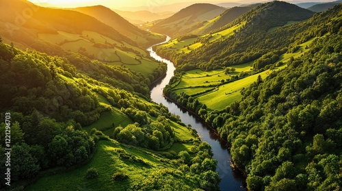 Lush Green Valley with Winding River, Golden Hour Drone Shot