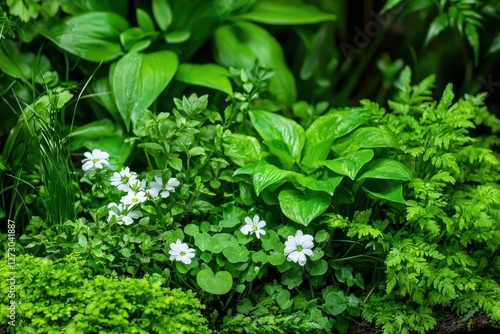 Lush Greenery and Delicate White Flowers in a Tranquil Garden Setting Capturing the Essence of Nature with Close Up View and Fresh Springtime Mood