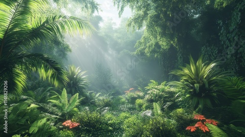 Lush greenery filled with vibrant foliage, dappled sunlight filtering through dense tree canopies.