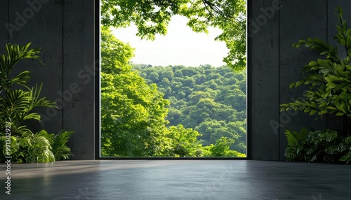 Lush greenery visible through modern window, serene indoor setting, natural light.