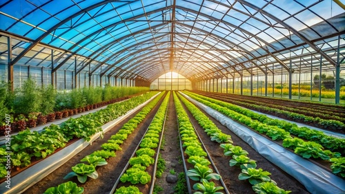 Lush Greenhouse Interior with Rows of Fresh Vegetables and Sunlight