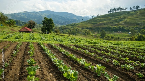 Lush Hillside Farm with Thriving Crops Under Scenic Sky