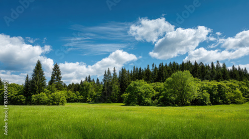 Lush meadow meets dense forest under a bright blue sky with scattered clouds