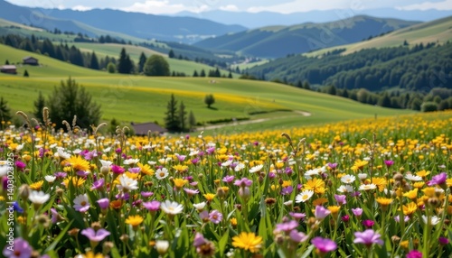 Lush Meadows Create a meadow scene filled with wildflowers swaying in the breeze, with soft, flowing hills in the background.