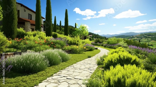 Lush Mediterranean garden featuring vibrant lavender fields under a bright blue sky.