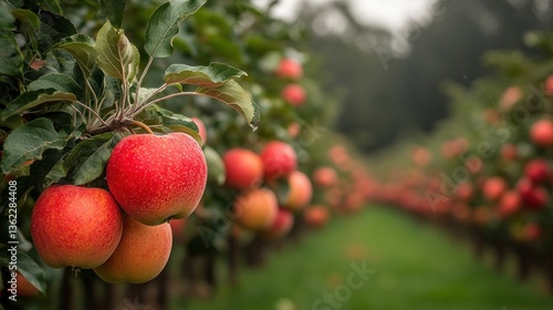 Lush orchard rows laden with ripe, red apples