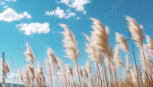 Lush Pampa Grass Against a Bright Blue Sky with Fluffy White Clouds Illuminated by Soft Light During a Tranquil Day in Nature's Beauty