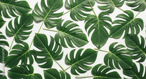 Lush pattern of monstera leaves arranged against a clean white backdrop