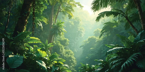 Lush rainforest canopy with vibrant green trees and ferns, sunlight filtering softly, creating a mystical, dense atmosphere.