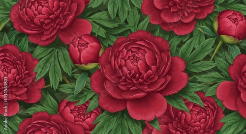 Lush Red Peonies Floral Pattern - Close-up view of a vibrant floral pattern featuring lush, deep red peonies with green foliage. Perfect for backgrounds and designs