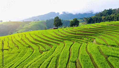 Lush rice field representing sustainable farming practices with open copy space for text and creative design