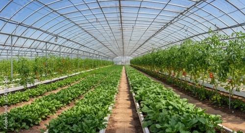 Lush rows of vibrant green produce flourish under the bright, expansive greenhouse roof, showcasing a bountiful harvest of fresh vegetables ready for market.