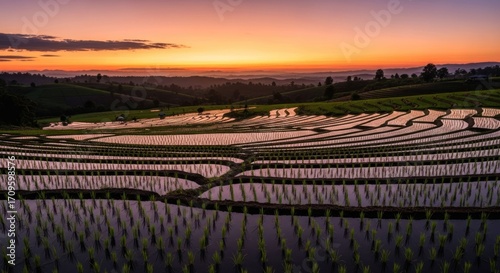 Lush terraced rice paddies at sunrise
