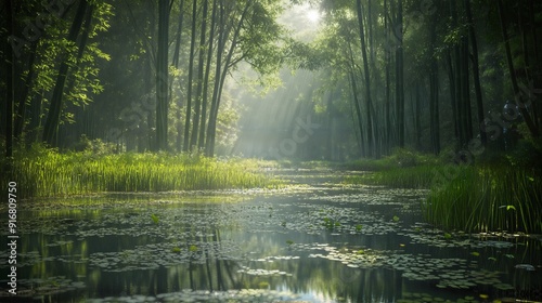 Lush Tranquil Bamboo Forest Serenity Reflections Sunlight Misty Water Lilies Nature