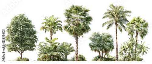 Lush tropical foliage cluster of diverse palm trees and verdant shrubs against a white backdrop