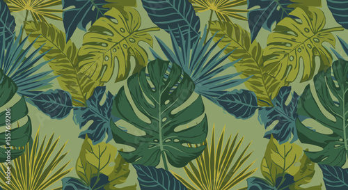 Lush Tropical Foliage Pattern with Monstera Palm and Broadleaf Plants.