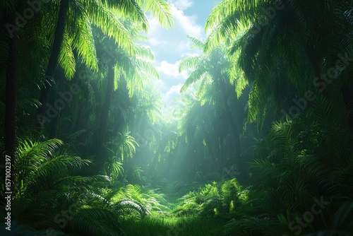 Lush tropical forest with sunlight filtering through the palm trees creates a vibrant, green scene