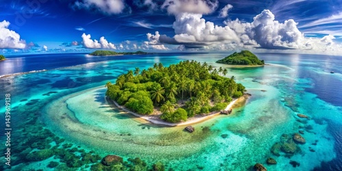 Lush Tropical Island Paradise An Aerial View of a Secluded Island Cove, Surrounded by Vibrant Turquoise Waters and a Coral Reef, Under a Dramatic Sky