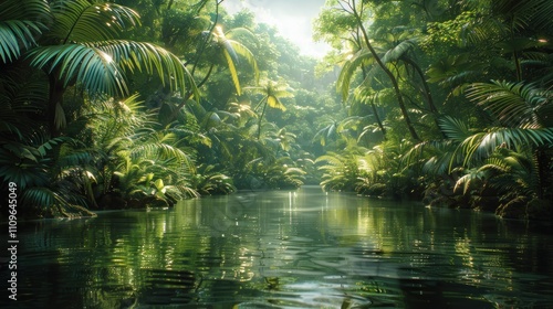 Lush tropical jungle river scene with sunlight streaming through the canopy.