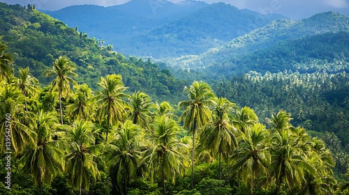 Lush tropical landscape with coconut palm trees on hillside, mountains background.