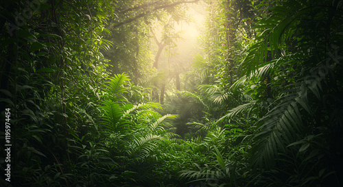 Lush Tropical Rainforest Path, Sunlight Dappled Through Canopy