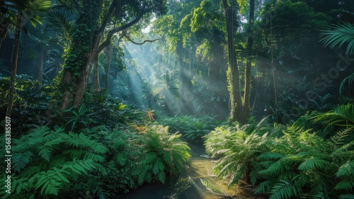 Lush tropical rainforest scene depicting sunlight streaming through dense canopy and illuminating verdant foliage and water