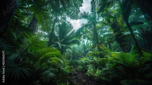 Lush tropical rainforest with dense green foliage and towering trees, creating a serene and vibrant natural environment.