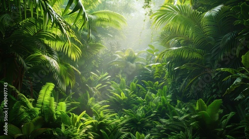 Lush Tropical Rainforest with Sunlight Filtering Through Dense Green Foliage and Vibrant Plant Life
