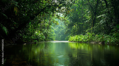 Lush tropical river surrounded by dense green jungle and vibrant nature