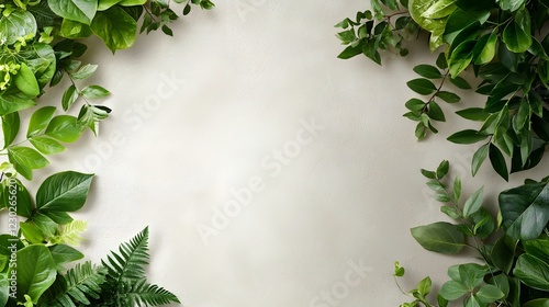 Lush vibrant green foliage frame forming a natural botanical background border Verdant leafy plants and herbs in a peaceful tranquil setting creating a fresh and organic design element
