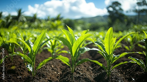 Lush, vibrant young plants sprout in fertile soil under a partly cloudy sky.