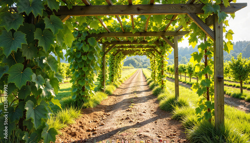 Lush vineyard arbour under sunlight, celebration of nature's bounty
