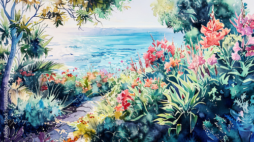 Lush watercolor of a coastal garden, vibrant coastal flowers, ocean backdrop, soft sunlight ,Ultra-High Detail, Ultra-Realistic