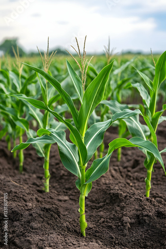 Lush young corn plants growing in dark soil under a cloudy sky