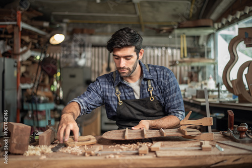 Luthier creating a guitar, clamps on the body of a guitar under construction improving glue adhesion