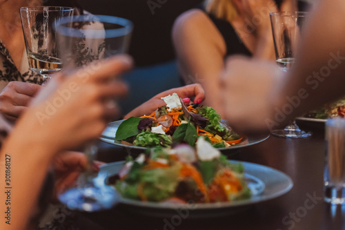 Lutsk, Ukraine - April 5, 2018: Friends at restaurant having dinner