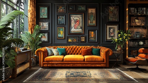 Luxe bohemian living room with a velvet sofa, gold accents, and eclectic art, luxury bohemian living room, bohochic meets luxury