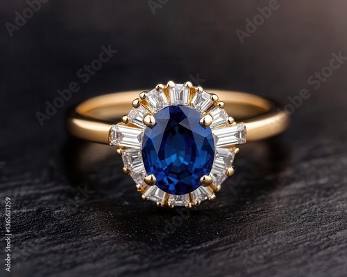 Luxe cocktail ring with a large oval sapphire surrounded by baguette diamonds, isolated on a polished black surface