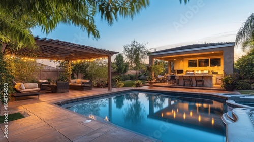 Luxurious backyard oasis with swimming pool, outdoor living area, and kitchen at sunset