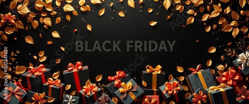 Luxurious black background, overflowing gift boxes, golden leaves, Black Friday sale, discount, metallic