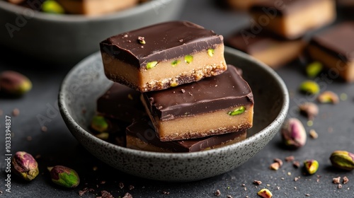 Luxurious chocolate squares filled with pistachios, artfully arranged in a modern bowl, blending vibrant green and rich brown for an indulgent treat.
