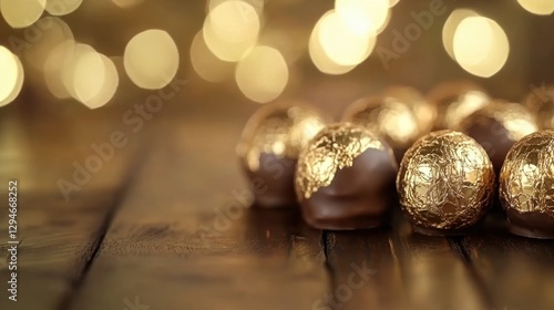 Luxurious Chocolate Treats on Wooden Surface with Soft Bokeh Lights