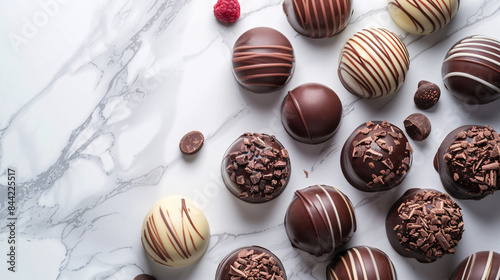 Luxurious chocolate truffles on elegant marble surface for world chocolate day design, ideal for adding text accompaniment